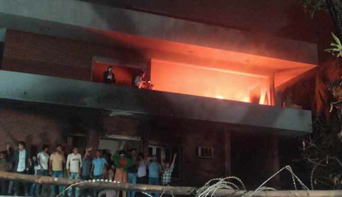 ধানমন্ডি শেখ বাড়িতে ব্যাপক ভাঙচুরের পর আগুন ধরিয়ে দেওয়া হয়েছে